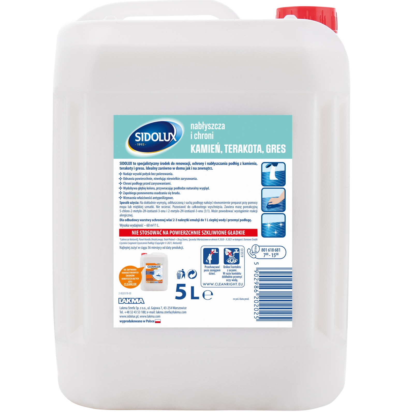Na czystą, odtłuszczoną powierzchnię nanieś skoncentrowany środek i rozprowadź go delikatnie za pomocą szmatki. Nie poleruj! Po trzykrotnym nałożeniu produktu należy podłogę zmyć środkiem Cleanux – zmywacz do Sidoluxu.