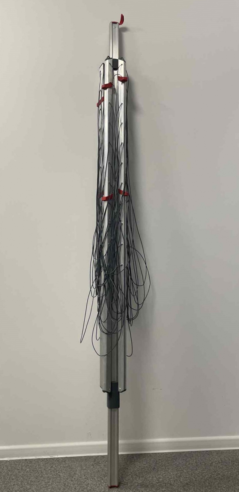 Suszarka posiada 4 haczyki na wieszaki na końcu każdego z ramion.