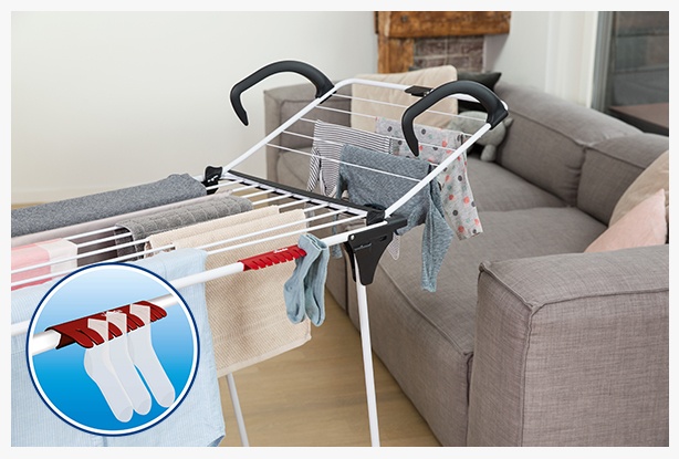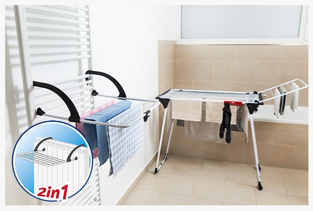 Vileda Premium 2 w 1 to suszarka, którą możesz używać na dwa sposoby - po rozłożeniu zachowuje się jak tradycyjna suszarka, a po zdjęciu skrzydła sprawdza się jako suszarka grzejnikowa lub balkonowa.