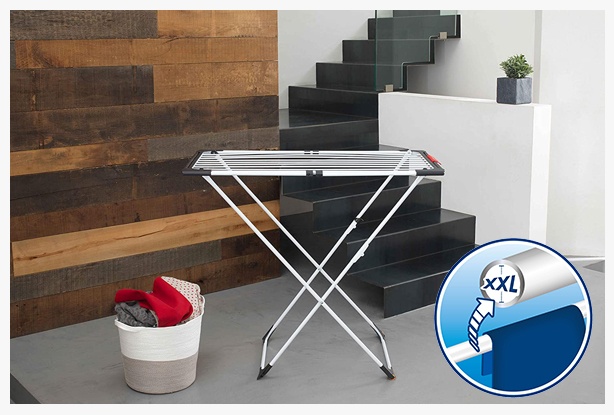 Rozkładana suszarka Surprise to efektywny sposób na suszenie prania. Suszarka została wyposażona w wysuwane skrzydła, które można regulować stosownie do oczekiwanej powierzchni. Wielość zastosowań gwarantuje regulacja długości od 110 cm do 187 cm. Dzięki grubym drutom eliminuje ryzyko powstania załamań na częściach garderoby, tym samym skraca proces prasowania. Doskonale sprawdza się w suszeniu mniejszego prania, nie zajmując przy tym większej przestrzeni. Po rozstawieniu pomieści większą ilość prania.